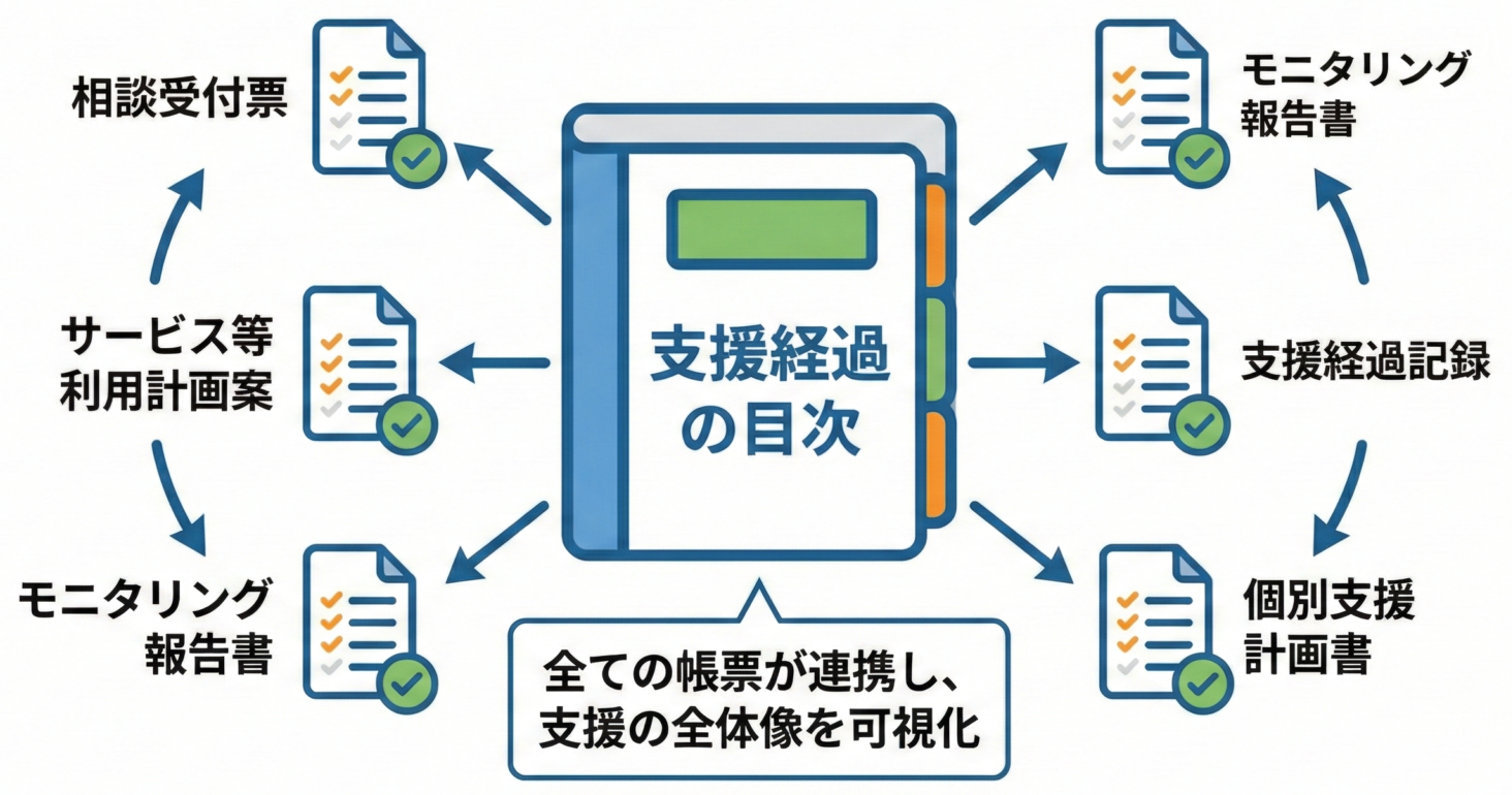 各利用者様の「歴史」を俯瞰して「目次」のように確認できますので、現在地を把握しやすくなったり、書類の不備にもすぐに気付けます。