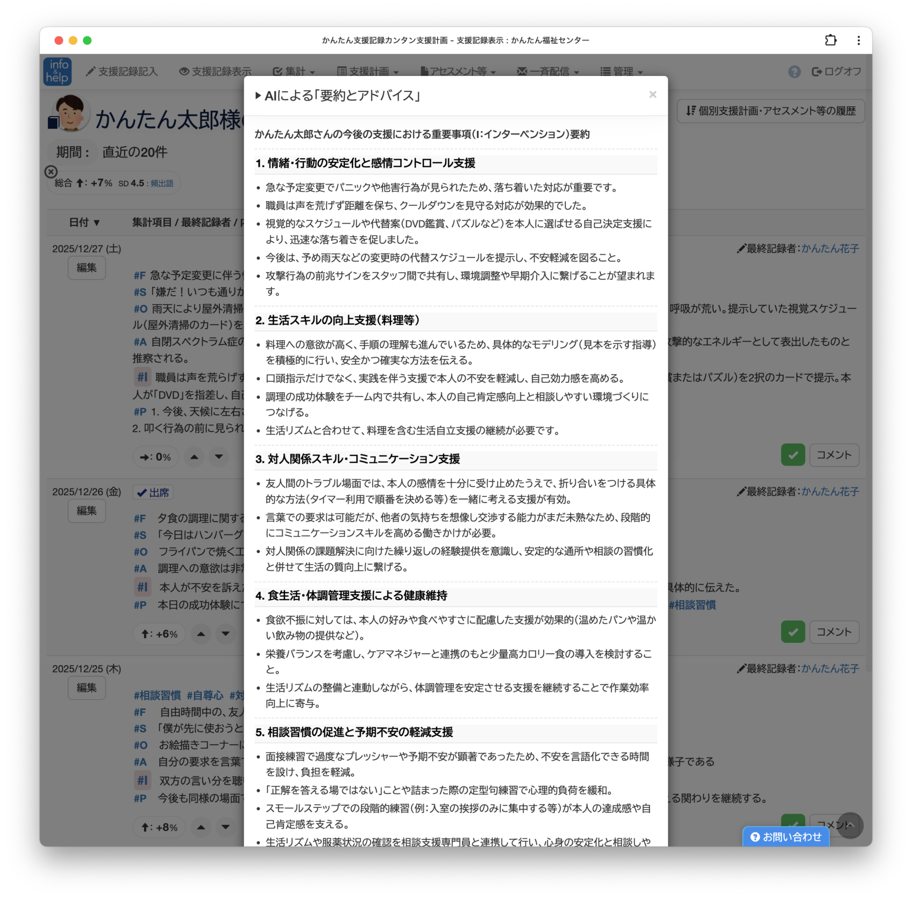このページでは、「F-SOAIPの各項目ごとの記録分析」、「個別支援計画との連携」、「ICTによる地域連携」といった、F-SOAIP を用いて「かんたん支援記録カンタン支援計画」に記録を記入していく際に役立つテクニックをご紹介いたします。