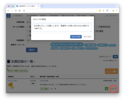 各記録ごとに、支援員同士で「コメント」もできるので、業務連絡をはじめ、意見交換やアドバイスなどもかんたんに行えます。