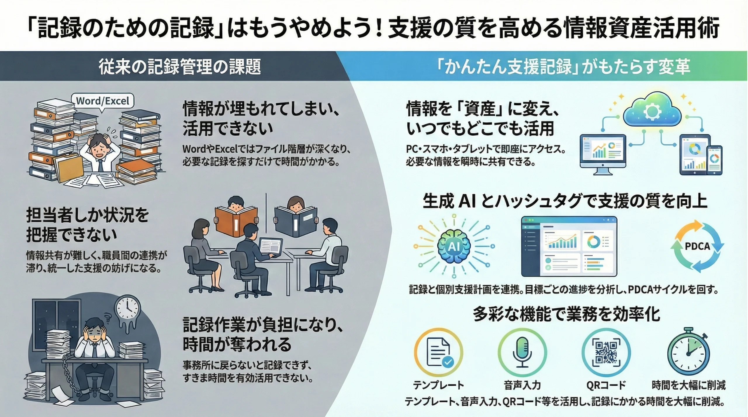 確かに文書の作成には Word が、一覧表の作成には Excel が、定番で使いやすいツールなのですが、支援記録や個別支援計画においては、時間をかけて書いた「記録データ」を、どれだけ「活かす」ことができるのか、という点も重要で、これによって「支援の質」や「支援に使える時間」、「記録にかけた時間の価値」は大きく変わってきます。